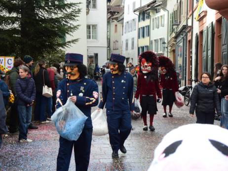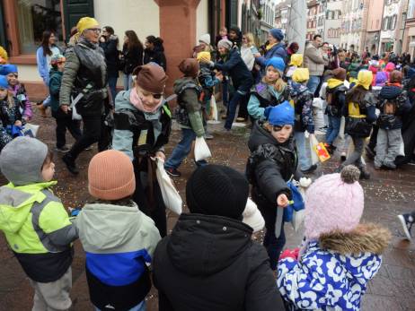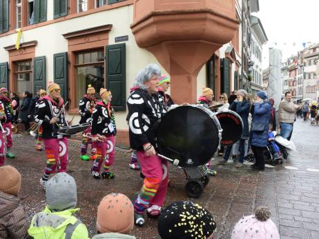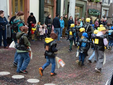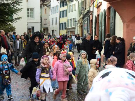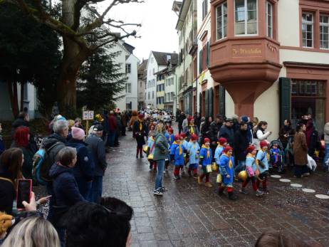 Pünktlich vor Umzugsbeginn hat es aufgehört zu regnen und zwischendurch zeigte sich sogar die Sonne. Die Freude war riesig; strahlende Gesichter, wohin man auch schaute. Ob mit selbstgebastelten Kostümen oder "Charivari" bunt gemischt machten sich die Schulkinder, musikalisch begleitet von allen Guggenformationen in Rheinfelden, auf die Route, welche von der Bahnhofstrasse über die Brodlaube und Marktgasse, nach einer extra Schlaufe durch die Rindergasse, wieder auf den Hauptwachplatz führte. Zahlreiche Zuschauerinnen und Zuschauer freuten sich ab dem bunten Kinderumzug.